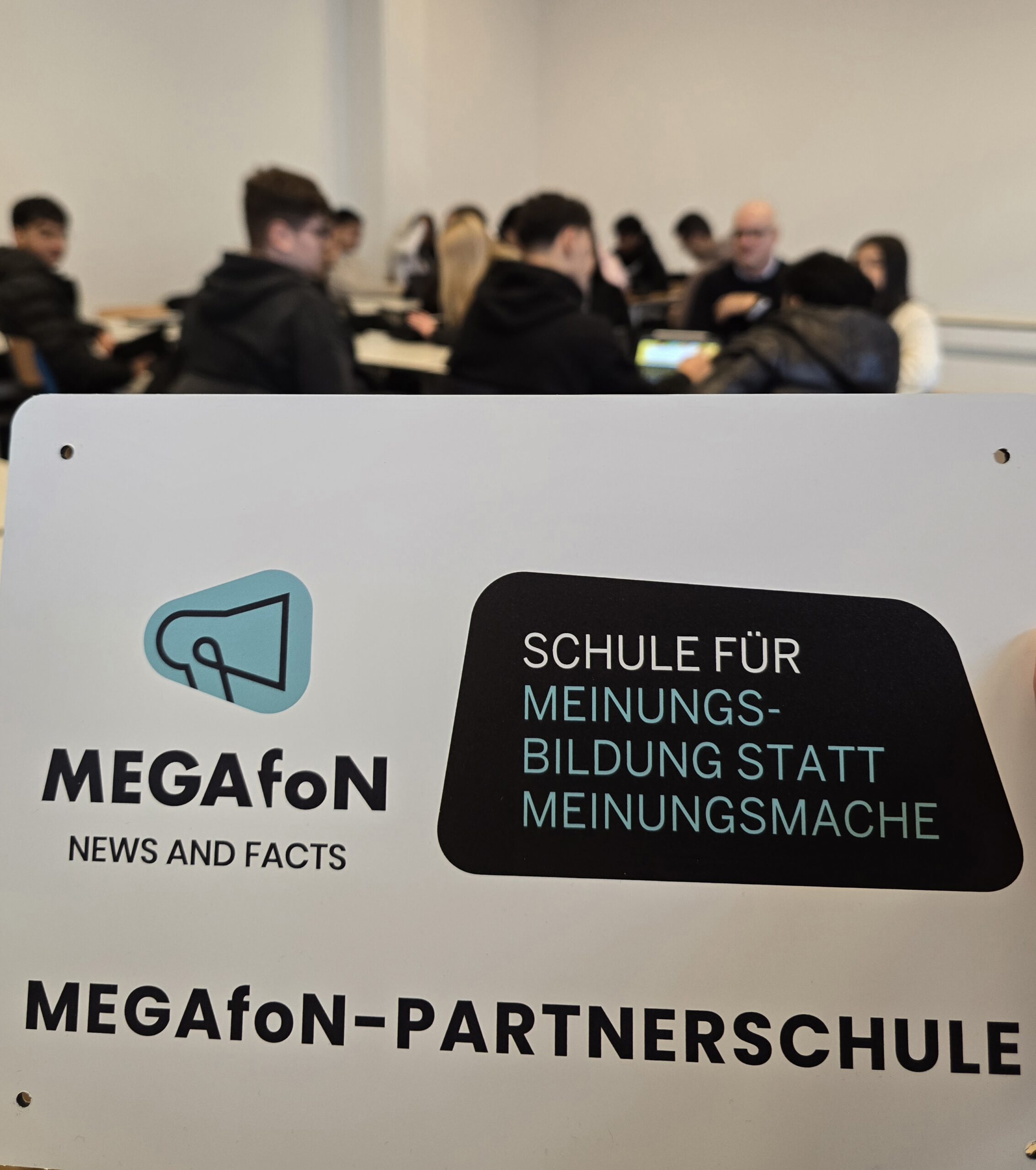 Die Schüler*innen zeigten reges Interesse, stellten Fragen und hörten den Ausführungen von Herrn Fredebold und Herrn Timm (AGFEO) aufmerksam zu. Die praxisnahen Beispiele führten zu lebhaften Diskussionen und motivierten die Teilnehmenden künftig bewusster mit Informationen umzugehen. Am Ende der Veranstaltung überreichte uns Herr Fredebold das MEGAfoN-Schild “SCHULE FÜR MEINUNGSBILDUNG STATT MEINUNGSMACHE”.
